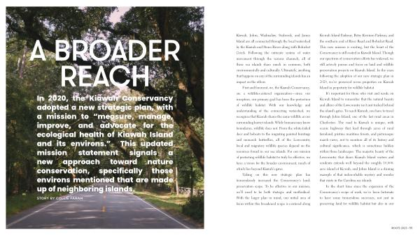 Kiawah Island Parkway , Betsy Kerrison Parkway , and the southern end of River Road and Bohicket Road . This new mission is exciting , but the heart of the Conservancy is still rooted in Kiawah Island . Though our spectrum of conservation efforts has widened , we still actively pursue and focus on land and wildlife preservation projects on Kiawah Island . In the years following the adoption of our new strategic plan in 2020 , we ’ ve preserved seven properties on Kiawah Island in perpetuity for wildlife habitat .