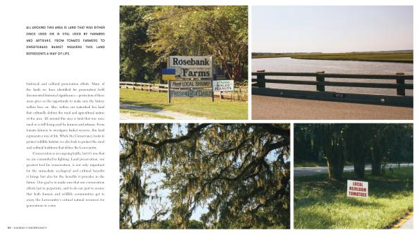 historical and cultural preservation efforts . Many of the lands we have identified for preservation hold documented historical significance — protection of these areas gives us the opportunity to make sure the history within lives on . Also , within our watershed lies land that culturally defines the rural and agricultural nature of the area . All around this area is land that was once used or is still being used by farmers and artisans . From tomato farmers to sweetgrass basket weavers , this land represents a way of life . While the Conservancy looks to protect wildlife habitat , we also look to protect the rural and cultural traditions that define the Lowcountry .