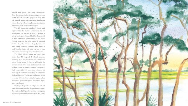 The fall watercolor workshop I hosted with support from the Kiawah Conservancy was an investigation into how the practice of painting a natural landscape in Kiawah Island has the potential to affect participants ’ connectedness to the island . Painting alongside the other artists , I witnessed firsthand how the experience helped participants build lasting memories , enhance their ability to recall specific plants , and paint together to form interpersonal relationships and personal reflection .