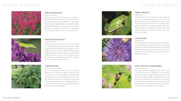 Polystichum acrostichoides One of several perennial ferns native to coastal SC , Christmas fern is the only one that is evergreen . It gets its name because it stays dark glossy green all through the holiday season . Once established in a shady area with even moisture , it forms robust and long-lived clumps and is often used as ground cover or mass planting under trees or shrubs , providing shelter for a variety of small animals and nesting material for songbirds .