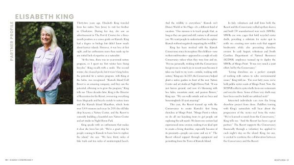 King has been involved with the Kiawah Conservancy since its inception . Her children — now in their mid-twenties — appeared in a couple of early Conservancy videos when they were four and six . “ For me personally , working with the Conservancy has given me so much joy in recent years because it takes me back to my roots — outside , working with nature ,” King says . In 2023 , the Conservancy helped plant a native garden in front of the new Nature Center and art studio at Night Heron Park . “ It was just barren ground , and now it ’ s blooming with bee balm , mountain mint , and passion flowers ,” King says . “ We can walk outside and see bees and hummingbirds . It ’ s just amazing !”