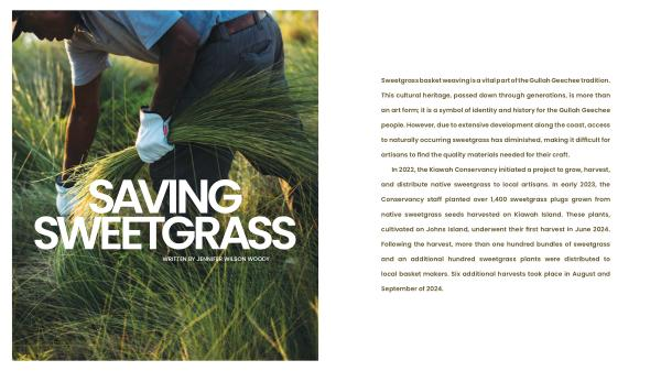 In 2022 , the Kiawah Conservancy initiated a project to grow , harvest , and distribute native sweetgrass to local artisans . In early 2023 , the Conservancy staff planted over 1,400 sweetgrass plugs grown from native sweetgrass seeds harvested on Kiawah Island . These plants , cultivated on Johns Island , underwent their first harvest in June 2024 . Following the harvest , more than one hundred bundles of sweetgrass and an additional hundred sweetgrass plants were distributed to local basket makers . Six additional harvests took place in August and September of 2024 .