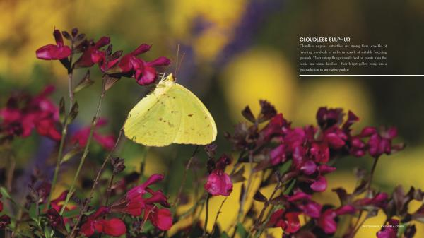 Cloudless sulphur butterflies are strong fliers , capable of traveling hundreds of miles in search of suitable breeding grounds . Their caterpillars primarily feed on plants from the cassia and senna families — their bright yellow wings are a great addition to any native garden !