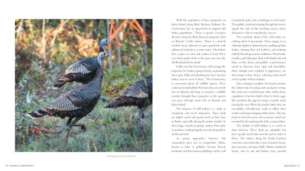 Collie says the Conservancy will manage the properties for turkeys going forward , maintaining open grass fields and planting pine trees because turkeys love to roost in them . “ The Conservancy is concerned about all wildlife species . We ’ re centered around habitat . We know they are mostly lost on Kiawah and hope to promote a wildlife corridor through these properties so the species can move through what ' s left on Kiawah and Johns Island .”