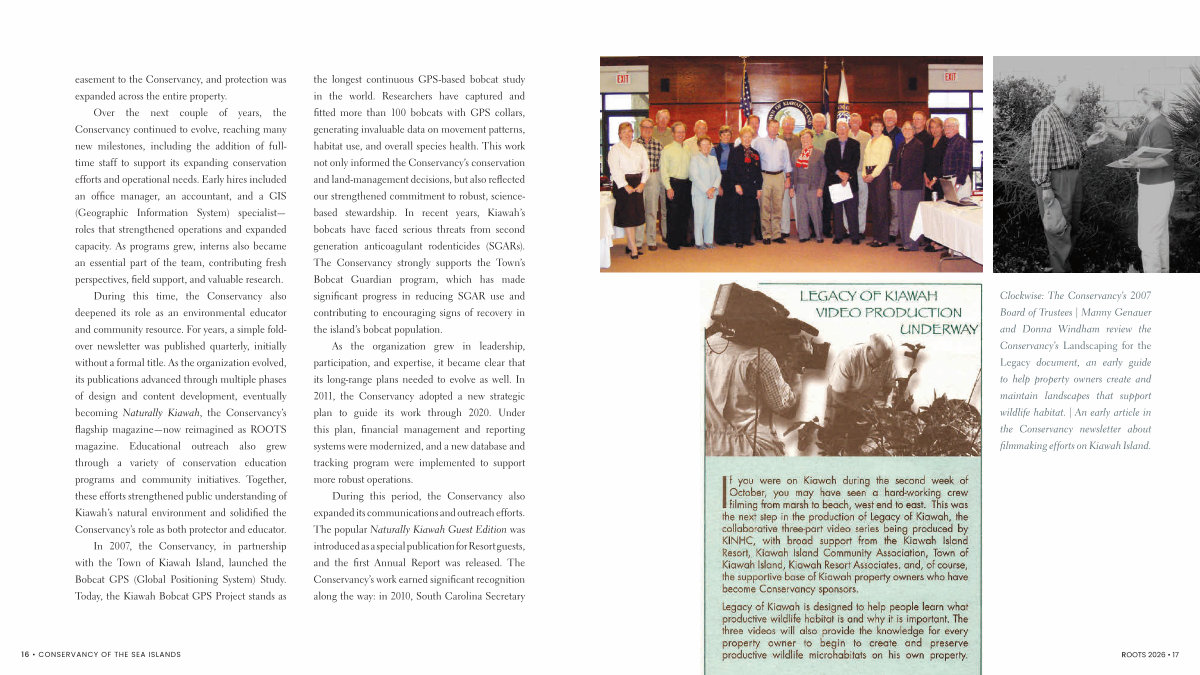 During this time, the Conservancy also deepened its role as an environmental educator and community resource. For years, a simple foldover newsletter was published quarterly, initially without a formal title. As the organization evolved, its publications advanced through multiple phases of design and content development, eventually becoming Naturally Kiawah, the Conservancy’ s flagship magazine— now reimagined as ROOTS magazine. Educational outreach also grew through a variety of conservation education programs and community initiatives. Together, these efforts strengthened public understanding of Kiawah’ s natural environment and solidified the Conservancy’ s role as both protector and educator.