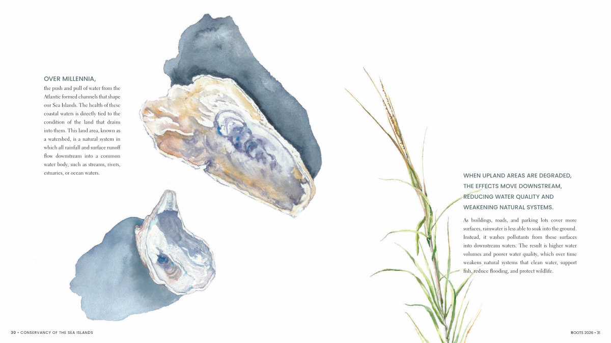OVER MILLENNIA, the push and pull of water from the Atlantic formed channels that shape our Sea Islands. The health of these coastal waters is directly tied to the condition of the land that drains into them. This land area, known as a watershed, is a natural system in which all rainfall and surface runoff flow downstream into a common water body, such as streams, rivers, estuaries, or ocean waters.