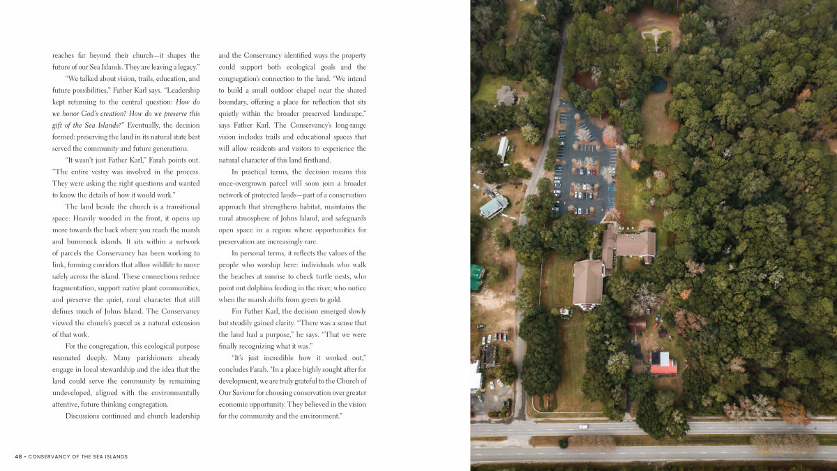 “ We talked about vision, trails, education, and future possibilities,” Father Karl says.“ Leadership kept returning to the central question: How do we honor God’ s creation? How do we preserve this gift of the Sea Islands?” Eventually, the decision formed: preserving the land in its natural state best served the community and future generations.