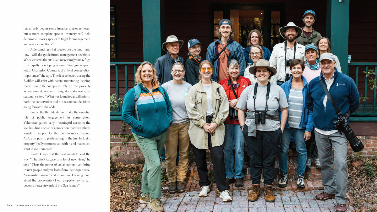 Bundrick says that the land needs to lead the way:“ The BioBlitz gave us a lot of new ideas,” he says.“ Thats the power of collaboration— you bring in new people and you learn from their experience. As an institution we need to continue learning more about the biodiversity of our properties so we can become better stewards of our Sea Islands.”
