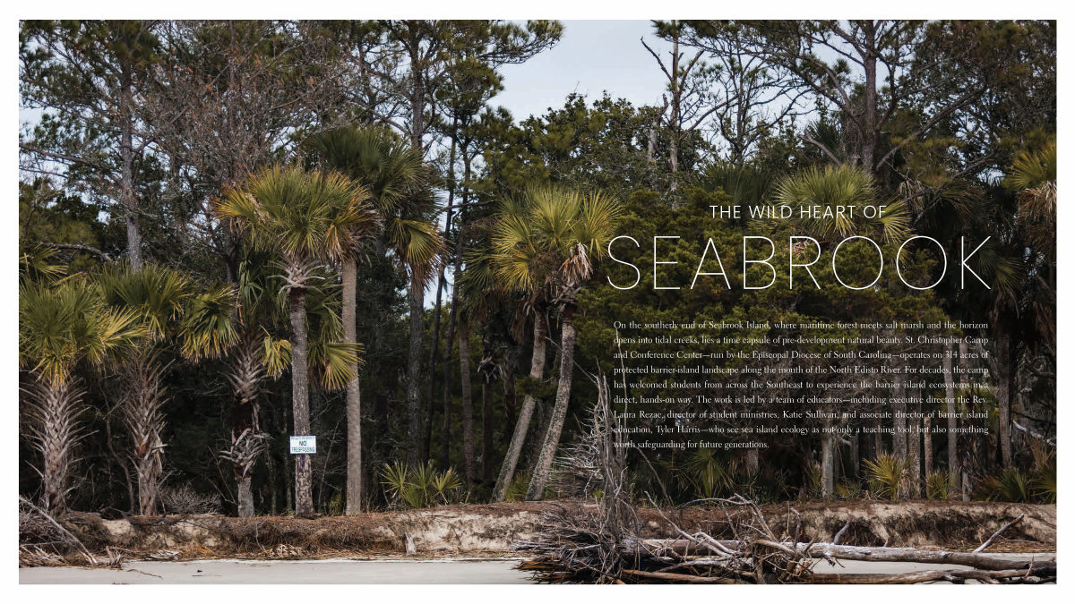 On the southerly end of Seabrook Island, where maritime forest meets salt marsh and the horizon opens into tidal creeks, lies a time capsule of pre-development natural beauty. St. Christopher Camp and Conference Center— run by the Episcopal Diocese of South Carolina— operates on 314 acres of protected barrier-island landscape along the mouth of the North Edisto River. For decades, the camp has welcomed students from across the Southeast to experience the barrier island ecosystems in a direct, hands-on way. The work is led by a team of educators— including executive director the Rev. Laura Rezac, director of student ministries, Katie Sullivan, and associate director of barrier island education, Tyler Harris— who see sea island ecology as not only a teaching tool, but also something worth safeguarding for future generations.