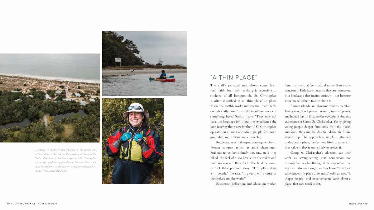 Clockwise: A birds-eye view of some of the cabins and meeting spaces at St. Christopher, looking out towards the North Edisto River. | Guests can kayak with St. Christopher staff to the neighboring islands and Privateer Point- the tip of the property, as shown here. | Executive director Rev. Laura Rezac, in kayaking gear