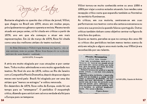 Bastante elogiada no quesito das críticas de jornal, Villiot, que chegou no Brasil em 1870, atuou em muitas peças, principalmente nos gêneros opereta e revista. Mesmo tendo atuado em peças antes, só foi citada em críticas a partir de 1876, ano em que ela começou a atuar em mais representações. Em 22 de março de 1876, Rose foi citada como uma das melhores atrizes do teatro nacional.