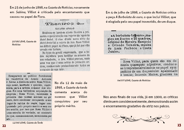 Em 4 de julho de 1898, a Gazeta de Notícias critica a peça A Borboleta de ouro, o que inclui Villiot, que é elogiada pelo seu papel travestido, de um duque.