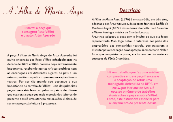 A peça A Filha de Maria Angu, de Artur Azevedo, foi muito encenada por Rose Villiot, principalmente na década de 1870 e 1880. Foi uma peça extremamente importante, recebendo muitas críticas positivas com as encenações em diferentes lugares do país e um retorno positivo do público que sempre a aplaudia nos teatros. Por ser tão grande seu destaque e sua importância na carreira de Villiot - uma das primeiras peças que a atriz levou ao palco no país -, decidiu-se que essa era a peça que mais merecia dos leitores do presente dossiê uma atenção maior, além, é claro, de ser uma peça cuja leitura é prazerosa.