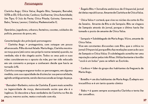 * Clarinha Angu = protagonista, com sotaque um pouco afrancesado. Filha da mal falada Maria Angu, Clarinha mostra-se moça pura (até como seu próprio nome remete) quando, na verdade, não é tão singela assim. Todos os seus pais e suas mães consideram-na o oposto da mãe, por ter sido educada em um convento e porque a conhecem desde que havia se tornado órfã.