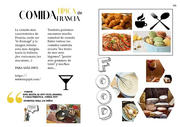 La comida más caracteristica de Francia, suele ser "le fromage" y la imagen interna esta más dirigida hacia la bollería.(les croissnats, les macarons...)
