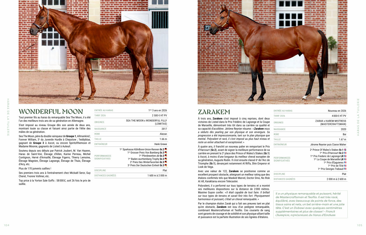À trois ans, Zarakem s’ est imposé à cinq reprises, dont deux victoires de Listed dans le Prix Frédéric de Lagrange et la Coupe de Marseille, démontrant très tôt dans sa carrière sa qualité et sa capacité d’ accélérer. Jérôme Reynier résume: « Zarakem nous a séduits dès yearling par son physique et son envergure. Sa progression a été impressionnante, tant sur le plan physique que mental. Polyvalent et racé, il s’ est imposé au plus haut niveau et reste un entier attachant et exceptionnel. »