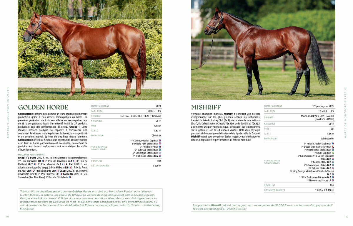 Véritable champion mondial, Mishriff a construit une carrière exceptionnelle sur les plus grandes scènes internationales. Lauréat du Prix du Jockey Club( Gr. 1), du Juddmonte International( Gr. 1), du Dubai Sheema Classic( Gr. 1) et de la Saudi Cup( Gr. 1), il a démontré une polyvalence unique, s’ imposant sur le dirt comme sur le gazon, et sur des distances variées. Doté d’ un physique puissant et d’ un pedigree d’ élite issu de la lignée mâle de Dubawi, Mishriff est né pour devenir un étalon majeur, capable d’ apporter classe, adaptabilité et performance à l’ échelle mondiale.