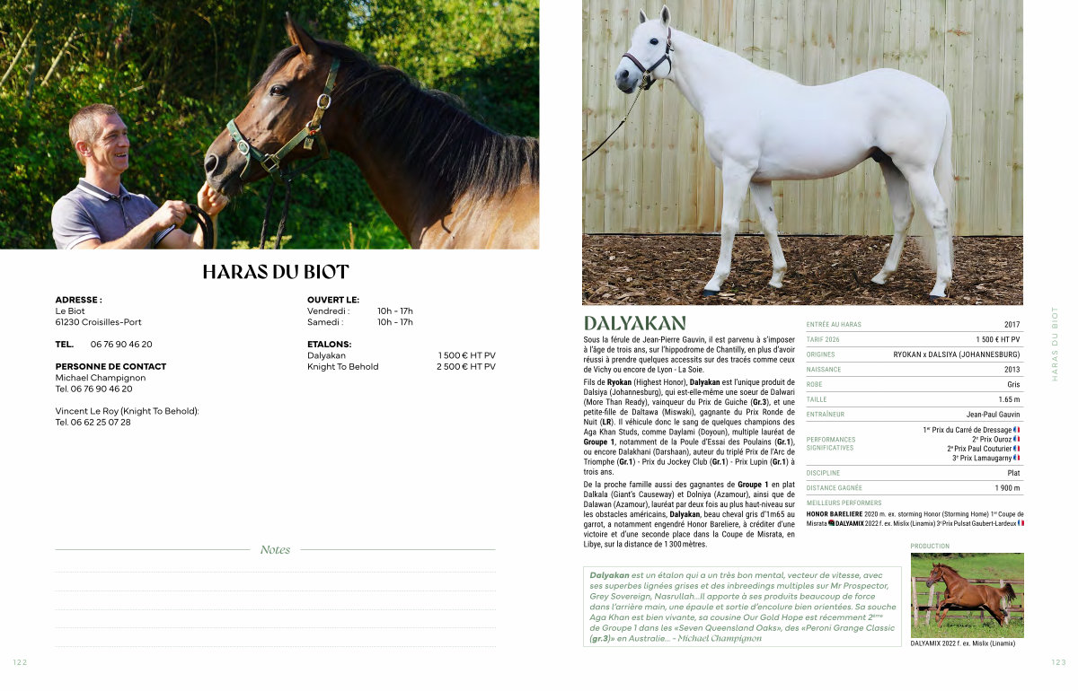 De la proche famille aussi des gagnantes de Groupe 1 en plat Dalkala( Giant’ s Causeway) et Dolniya( Azamour), ainsi que de Dalawan( Azamour), lauréat par deux fois au plus haut-niveau sur les obstacles américains, Dalyakan, beau cheval gris d’ 1m65 au garrot, a notamment engendré Honor Bareliere, à créditer d’ une victoire et d’ une seconde place dans la Coupe de Misrata, en Libye, sur la distance de 1 300 mètres.