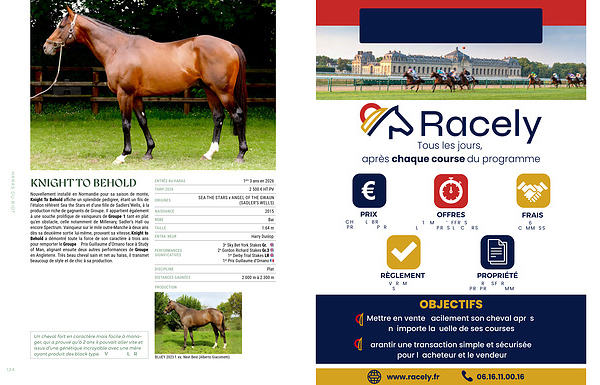 Nouvellement installé en Normandie pour sa saison de monte, Knight To Behold affiche un splendide pedigree, étant un fils de l’ étalon référent Sea the Stars et d’ une fille de Sadlers’ Wells, à la production riche de gagnants de Groupe. Il appartient également à une souche prolifique de vainqueurs de Groupe 1 tant en plat qu’ en obstacle, celle notamment de Millenary, Sadler’ s Hall ou encore Spectrum. Vainqueur sur le mile outre-Manche à deux ans dès sa deuxième sortie lui-même, prouvant sa vitesse, Knight to Behold a démontré toute la force de son caractère à trois ans pour remporter le Groupe 2 Prix Guillaume d’ Ornano face à Study of Man, alignant ensuite deux autres performances de Groupe en Angleterre. Très beau cheval sain et net au haras, il transmet beaucoup de style et de chic à sa production.