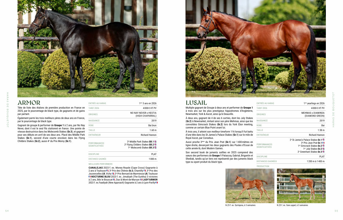 NOCTURNE BLOU 2023 f. ex. Jimaliyah( The Gurkha) 3 victoires à 2 ans, Bdx le Bouscat, Dax & Mont-de-Marsan LADY’ ARMOR 2023 f. ex. Faadiyah( New Approach) Gagnante à 2 ans à Lyon-Parilly
