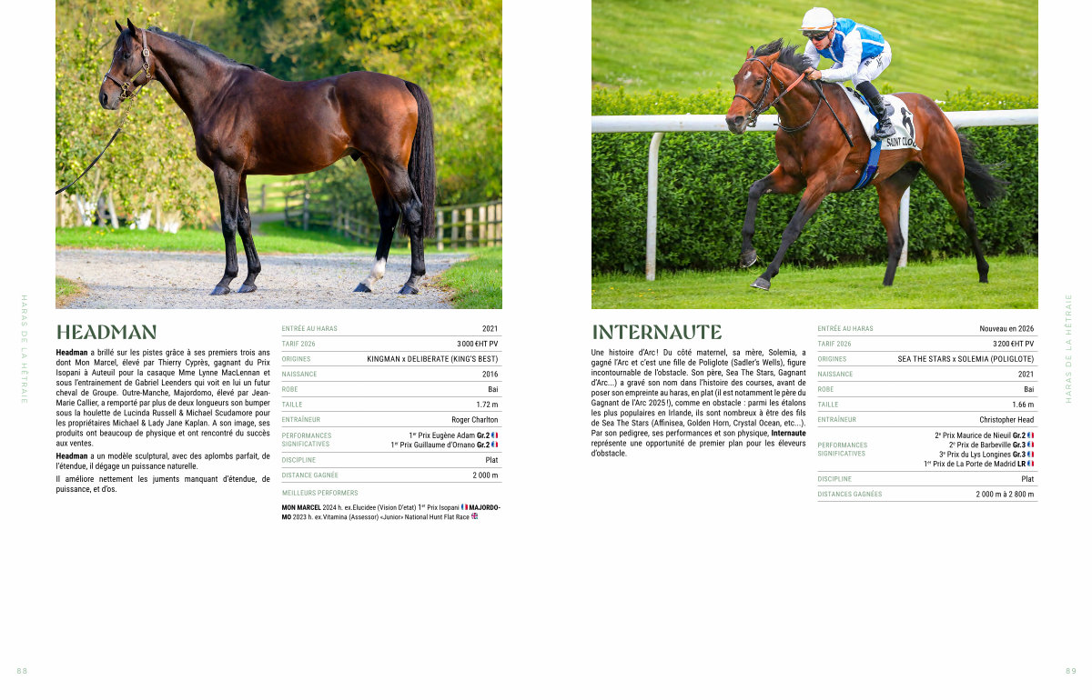 Une histoire d’ Arc! Du côté maternel, sa mère, Solemia, a gagné l’ Arc et c’ est une fille de Poliglote( Sadler’ s Wells), figure incontournable de l’ obstacle. Son père, Sea The Stars, Gagnant d’ Arc...) a gravé son nom dans l’ histoire des courses, avant de poser son empreinte au haras, en plat( il est notamment le père du Gagnant de l’ Arc 2025!), comme en obstacle: parmi les étalons les plus populaires en Irlande, ils sont nombreux à être des fils de Sea The Stars( Affinisea, Golden Horn, Crystal Ocean, etc...). Par son pedigree, ses performances et son physique, Internaute représente une opportunité de premier plan pour les éleveurs d’ obstacle.