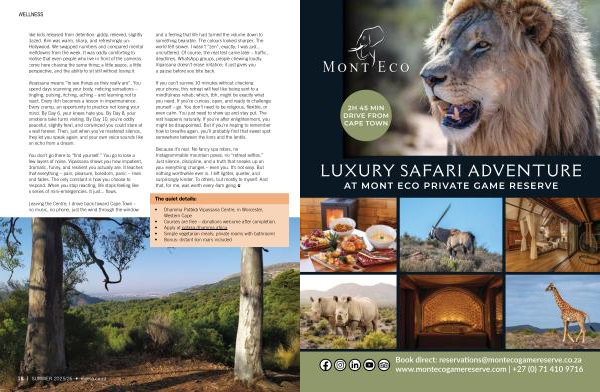 Leaving the Centre, I drove back toward Cape Town – no music, no phone, just the wind through the window and a feeling that life had turned the volume down to something bearable. The colours looked sharper. The world felt slower. I wasn’ t“ zen”, exactly; I was just... uncluttered. Of course, the real test came later – traffic, deadlines, WhatsApp groups, people chewing loudly. Vipassana doesn’ t erase irritation; it just gives you a pause before you bite back.