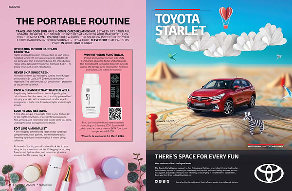 NEVER SKIP SUNSCREEN. No matter whether you’ re chasing sunsets in the Kruger or cocktails in St Lucia, SPF 50 should be your nonnegotiable. The best formulas pull double duty – protection by day, primer by default.