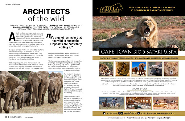 THEY DON’ T BUILD WITH BRICK OR BRANCH, YET ELEPHANTS ARE AMONG THE GREATEST ENGINEERS ON EARTH. EVERY STEP, EVERY FEED, EVERY WALLOW RESHAPES THE LANDSCAPE THEY CALL HOME, AND THE WILDERNESS WE GO TO SEE.