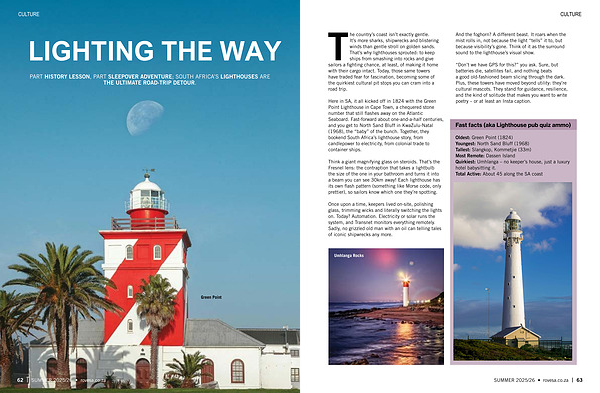 Here in SA, it all kicked off in 1824 with the Green Point Lighthouse in Cape Town, a chequered stone number that still flashes away on the Atlantic Seaboard. Fast-forward about one-and-a-half centuries, and you get to North Sand Bluff in KwaZulu-Natal( 1968), the“ baby” of the bunch. Together, they bookend South Africa’ s lighthouse story, from candlepower to electricity, from colonial trade to container ships.