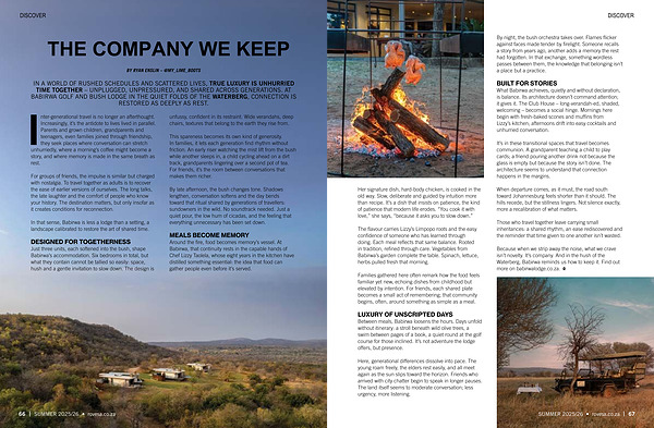 IN A WORLD OF RUSHED SCHEDULES AND SCATTERED LIVES, TRUE LUXURY IS UNHURRIED TIME TOGETHER – UNPLUGGED, UNPRESSURED, AND SHARED ACROSS GENERATIONS. AT BABIRWA GOLF AND BUSH LODGE IN THE QUIET FOLDS OF THE WATERBERG, CONNECTION IS RESTORED AS DEEPLY AS REST.
