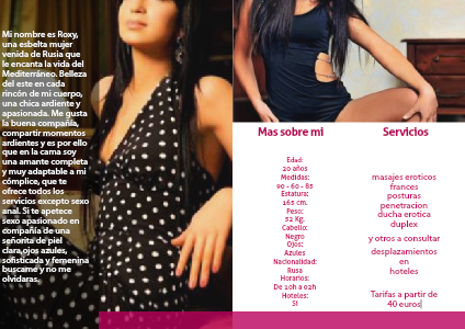 Mi nombre es Roxy, una esbelta mujer venida de Rusia que le encanta la vida del Mediterráneo. Belleza del este en cada rincón de mi cuerpo, una chica ardiente y apasionada. Me gusta la buena compañía, compartir momentos ardientes y es por ello que en la cama soy una amante completa y muy adaptable a mi cómplice, que te ofrece todos los servicios excepto sexo anal. Si te apetece sexo apasionado en compañía de una señorita de piel clara,ojos azules, sofisticada y femenina buscame y no me olvidaras.