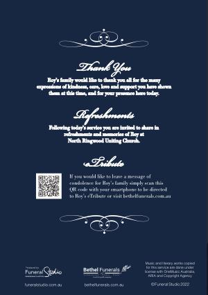 If you would like to leave a message of condolence for Roy ’ s family simply scan this QR code with your smartphone to be directed to Roy ’ s eTribute or visit bethelfunerals . com . au