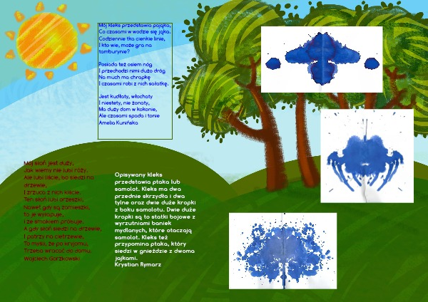 Opisywany kleks przedstawia ptaka lub samolot. Kleks ma dwa przednie skrzydła i dwa tylne oraz dwie duże kropki z boku samolotu. Dwie duże kropki są to statki bojowe z wyrzutniami baniek mydlanych, które otaczają samolot. Kleks też przypomina ptaka, który siedzi w gnieździe z dwoma jajkami.
