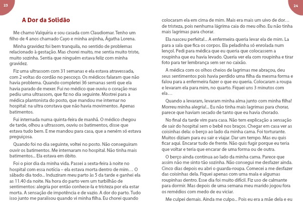 Foi o pior dia da minha vida. Passei a sexta-feira à noite no hospital com essa notícia – ela estava morta dentro de mim… O sábado dia todo... Induziram meu parto às 5 da tarde e ganhei ela as 11.40 da noite. Na hora do parto vem um turbilhão de sentimentos: alegria por então conhece-la e tristeza por ela estar morta. A sensação de impotência e de vazio. A dor do parto. Tudo isso junto me paralisou quando vi minha filha. Eu chorei quando