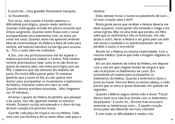 Pois só eu, meu marido e família sabemos a dificuldade psicológica, quanto medo sentimos. Quantas madrugadas acordei em pânico achando que estava sangrando. Quantas vezes ficava com o sonar acompanhando seus batimentos (sim, eu tinha um sonar em casa). Quantas vezes me apavorei sentindo falta de movimentação da Helena e fazia de tudo para senti-la, até fazendo barulhos na barriga para assusta-la... Pois o susto dela me acalmava!
