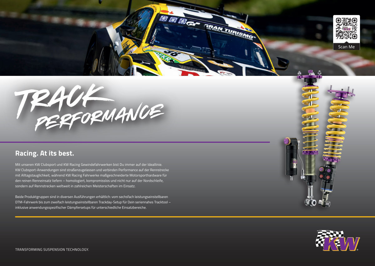 Mit unseren KW Clubsport und KW Racing Gewindefahrwerken bist Du immer auf der Ideallinie. KW Clubsport-Anwendungen sind straßenzugelassen und verbinden Performance auf der Rennstrecke mit Alltagstauglichkeit, während KW Racing Fahrwerke maßgeschneiderte Motorsporthardware für den reinen Renneinsatz liefern – homologiert, kompromisslos und nicht nur auf der Nordschleife, sondern auf Rennstrecken weltweit in zahlreichen Meisterschaften im Einsatz.