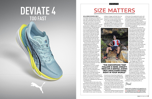 As a bigger guy I like running with music to drown out the thunderous noise of my tree trunks pounding the pavement, but I too have been tempted to hurl an annoying boom box from a fellow runner with“ poor taste”. What is“ acceptable” music is so subjective, but our Last Word columnist Stuart Mann has some suggestions to ease the disharmony( page 130). What’ s your take on it? Go to our Facebook collaboration to let us know.
