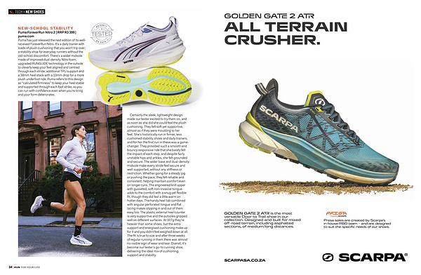Puma ForeverRun Nitro 2 | RRP R3 399 | puma. com Puma has just released the next edition of its wellreceived ForeverRun Nitro. It’ s a daily trainer with loads of plush cushioning that you won’ t trip over; a stability shoe for everyday runners without the old-school discomfort. There’ s a wider midsole made of improved dual-density Nitro foam, upgraded RUNGUIDE technology in the outsole to cleverly keep your feet aligned and centred through each stride; additional TPU support and a 38mm heel stack with a 10mm drop for a more plush underfoot ride. Puma refers to this design as“ calculated firmness” to keep your heel stable and supported through each foot strike, so you can run with confidence even when you’ re tiring and your form deteriorates.
