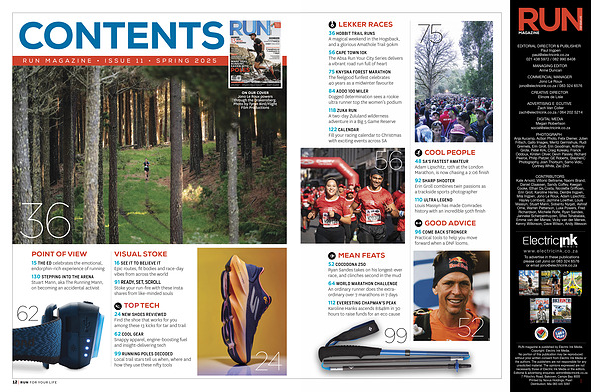 RUN magazine is published by Electric Ink Media. Copyright: Electric Ink Media. No portion of this publication may be reproduced without prior written consent from Electric Ink Media or the authors. The publishers are not responsible for any unsolicited material. The opinions expressed are not necessarily those of Electric Ink Media or the editors. Editorial & advertising enquiries: admin @ electricink. co. za