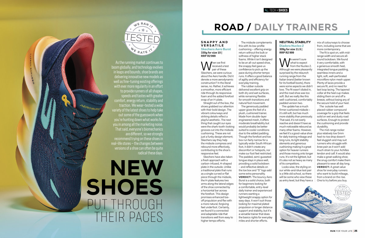 The generously padded upper gives the feel of a plush, cushioned trainer. Made from double-layer engineered mesh, it offers moderate breathability but would probably be better suited to cooler conditions due to the added padding. Though the forefoot and toe box run fairly narrow for a typically wider South African foot, it didn’ t create any discomfort or hotspots, nor make our foot feel restricted. The padded, semi-gusseted tongue stays in place well, providing a solid lockdown – and reflective details on the toe box and“ S” logo add some extra personality. VERDICT: The bouncy Aero Burst is a solid choice, both for beginners looking for a comfortable, entry-level daily trainer and experienced runners wanting a lightweight snappy option for easy days. It won’ t suit those looking for maximal plated propulsion or longer distance support and stability, but it’ s a versatile trainer that does the basics rights for everyday miles and shorter efforts.