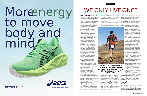In my role as editor of endurance sport publications, I speak to many athletes who can tell you exactly how many medals they have and the finish times they achieved – but can barely recollect the scenery of each or other runners they shared the road with. I also witness countless examples of demeaning or lighthearted belittling of shortdistance runners, and radically skewed media and sponsorship attention on race distances that amateurs with balanced lives can’ t afford to race year after year, yet find themselves toeing the line at again and again. We only have so many weekends in our lives and one set of hard-working joints.