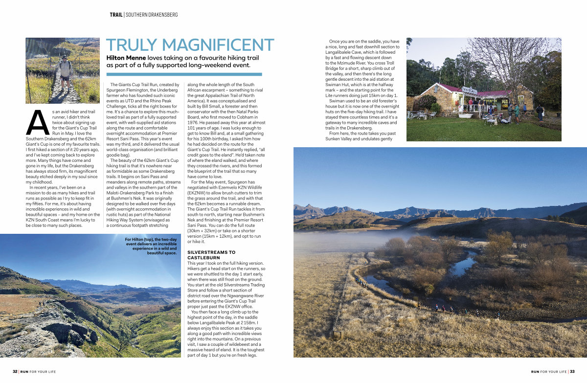 Hilton Menne loves taking on a favourite hiking trail as part of a fully supported long-weekend event. s an avid hiker and trail runner, I didn’ t think twice about signing up for the Giant’ s Cup Trail Run in May. I love the Southern Drakensberg and the 62km Giant’ s Cup is one of my favourite trails. I first hiked a section of it 20 years ago, and I’ ve kept coming back to explore more. Many things have come and gone in my life, but the Drakensberg has always stood firm, its magnificent beauty etched deeply in my soul since my childhood.