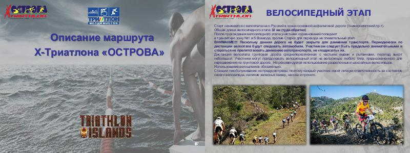 Старт начинается с велоэтапа на о. Русский в конце основной асфальтовой дороги( Университетский пр-т). Общая длина велосипедного этапа 32 км( туда-обратно). После прохождения велосипедного этапа участники соревнований попадают в транзитную зону № 1 в б. Воевода, пролив Старка для перехода на плавательный этап. ВНИМАНИЕ!!! Поскольку данная дорога не будет закрыта для движения транспорта. Периодически по дистанции велоэтапа будут следовать автомобили. Участникам следует быть предельно внимательными и стараться не препятствовать движению автотранспорта, не « подрезать » их. Дистанция велоэтапа грунтовая дорога среднепересеченная с частыми ямами и рытвинами, перепад высот небольшой. Участники могут преодолевать велосипедный этап на велосипеде любого типа, предназначенного для передвижения по грунтовой дороге. Не рекомендуется использование разделочных и шоссейных велосипедов. Использование велошлемов обязательно. Станции техобслуживания не предусмотрены, поэтому каждый участник несет личную ответственность за состояние своего велосипеда, наличие запасных камер, насоса и прочего.