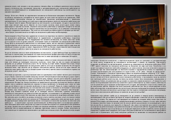 некаква услуга, што секако е во ред доколку станува збор за слободно донесена лична одлука. Лошите статистики кои покажуваат насилство и дискриминација кон сексуалните работници се резултат на неразбирањето и неприфаќањето на сексуалните работници од институциите и од нивните сограѓани“.