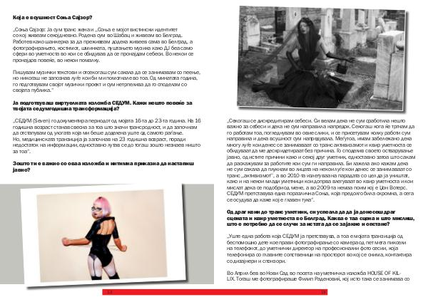 „ Секогаш се дискредитирам себеси. Си велам дека не сум сработила нешто важно за себеси и дека не сум направила напредок. Секогаш кога ќе тргнам да го работам тоа, погледнувам во овие слики, и се присетувам колку работи сум направила и дека всушност сум напредувала. Меѓутоа, имам забележано дека многу луѓе кои денес се занимаваат со транс активизамот и квир уметноста се обидуваат да ме дескридетираат без причина. Го споделив своето остварување јавно, од истите причини како и секој друг уметник, едноставно затоа што сакам да раскажувам за работите кои сум ги направила. Би лажела ако кажам дека не сум сакала да плукнам во лицата на некои луѓе кои денес се занимаваат со транс,, активизмот’’, а во 2010-та излегуваа на парадата со цел да ја уништат, како и на некои млади уметници кои допрва влегуваат во квир уметноста и кои мислат дека се подобри од мене, а во 2009-та немаа поим кој е Џон Вотерс. СЕДУМ претставува една поразлична Соња, која предолго била скромна, а сега се осудува да каже кој е главен тука“.