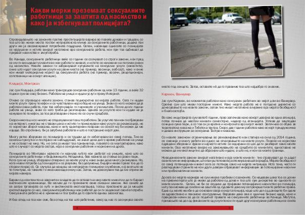 Полицијата во Монтреал најчесто ги казнува луѓето кои работат на улиците, како што се сексуалните работници и бездомниците. Неодамна, бев казнета за стоење во јавен парк. Кога сум на улица, зборувам отворено за моите услуги, иако знам дека многу ризикувам. Но, кога имам потреба од полицијата и се јавувам, без двоумење, бидејќи имам право тоа да го сторам покрај сè. Се случува да наидеш на непријатен полициски службеник, кој воопшто не те почитува, но таквите ги има насекаде околу нас. Затоа, не дозволувам тоа да ме спречи во мојата намера.