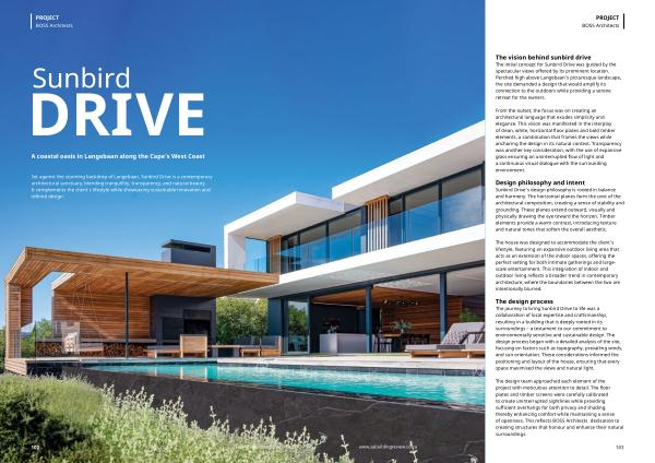 Set against the stunning backdrop of Langebaan, Sunbird Drive is a contemporary architectural sanctuary, blending tranquillity, transparency, and natural beauty. It complements the client’ s lifestyle while showcasing sustainable innovation and refined design.