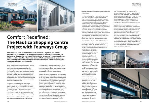 Together with our esteemed partners, we have realised a shared vision and continue to strive to set benchmarks for excellence in retail design. Fourways remains committed to pushing what is possible in air conditioning technology. Our goal is to continue developing solutions that enhance comfort and efficiency and contribute to a more sustainable future. The success of the Nautica Shopping Centre project is a powerful reminder of the impact that innovative technology and strong partnerships can have, and we are excited to build on this momentum in all our HVAC projects. Fourways is proud to have played a part in this transformation, and we look forward to continuing our mission of redefining comfort through cuttingedge air conditioning solutions. ■