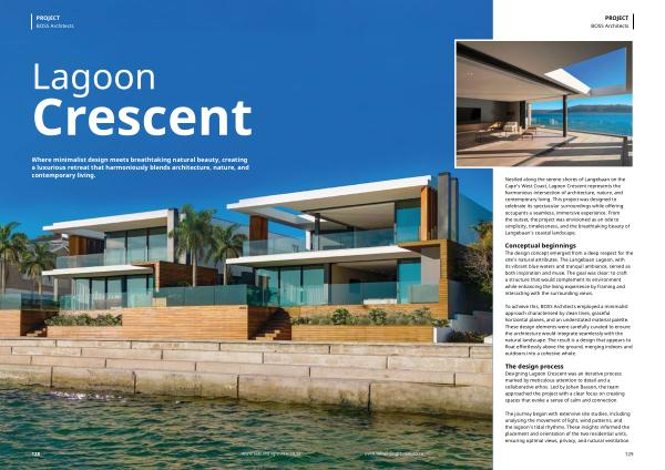 The journey began with extensive site studies, including analysing the movement of light, wind patterns, and the lagoon’ s tidal rhythms. These insights informed the placement and orientation of the two residential units, ensuring optimal views, privacy, and natural ventilation. www. sabuildingreview. co. za 129