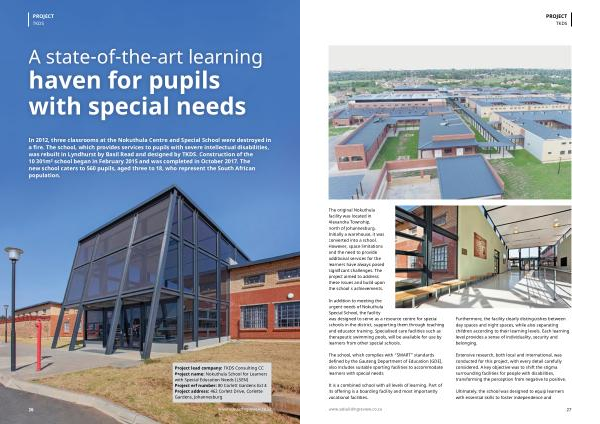 In 2012, three classrooms at the Nokuthula Centre and Special School were destroyed in a fire. The school, which provides services to pupils with severe intellectual disabilities, was rebuilt in Lyndhurst by Basil Read and designed by TKDS. Construction of the 10 301m ² school began in February 2015 and was completed in October 2017. The new school caters to 560 pupils, aged three to 18, who represent the South African population.